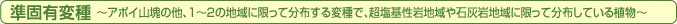 - 準固有変種 ~アポイ山塊の他、1~2の地域に限って分布する変種で、超塩基性岩地域や石灰岩地域に限って分布している植物~