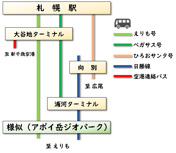 - ■札幌→道南バス[ペガサス号]・1日5往復(3時間45分)→浦河ターミナル→ジェイ・アール北海道バス(25分)→様似