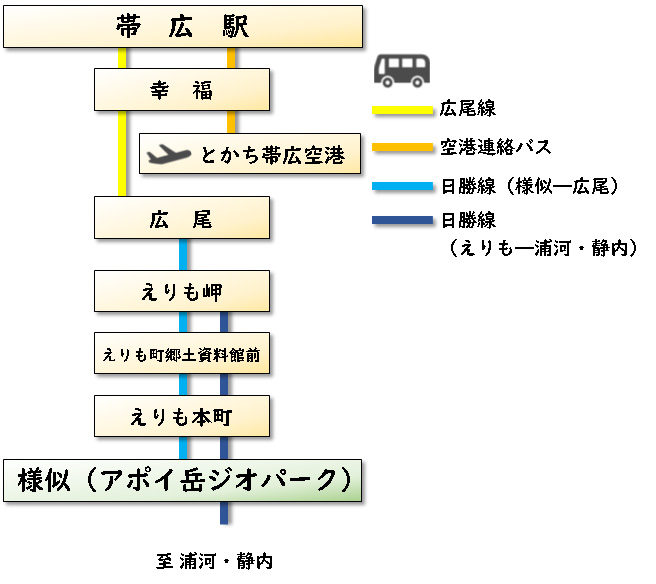 - ■帯広→十勝バス(2時間20分)→広尾→ジェイ・アール北海道バス・平日3往復/休日2往復(2時間)→様似