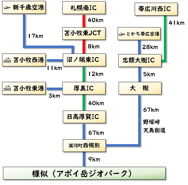 - ■札幌南IC→道央自動車道→苫小牧東IC(JCT)→日高自動車道→日高厚賀IC→一般道→様似(約2時間50分)