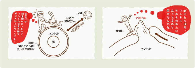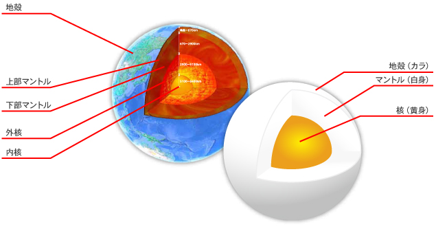 地球の構造は、よくゆで卵に例えられます。外側のカラの部分が「地殻」、その内側の白身の部分が「マントル」、一番真ん中の黄身の部分が「核」です。地殻は、数㎞~数十㎞の厚さがありますが、地球の大きさからみればゆで卵のカラのように薄い岩石の層です。しかし、人類は、地球から何千万㎞も離れた火星に探査機を送り込むほどの科学力を身に着けているにもかかわらず、いまだにこの薄い層を掘り進めてその下のマントルを実際に手にしたことはありません。つまり、わずか数十㎞下のマントルの世界は、人類にとって火星よりも遠い未知の世界なのです。