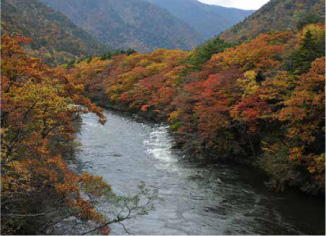 アポイ岳の東方に、約8㎞にわたって続くかんらん岩の峡谷が幌満峡です。渓谷の山腹には、原生的な針広混交林が広がり、なかでもキタゴヨウは、分布の北限であり山腹一帯に優占的に分布するという特異性もあって、1943(昭和18)年に国の天然記念物に指定されています。10月下旬の紅葉は知る人ぞ知る名所です。また、途中には、昭和初期に日高地方の電源開発の先駆けとなった水力発電所があり、産業遺産ともいえるたたずまいを見せています。林道の幅員は狭く未舗装ですが、要所に退避スペースが設けられており、乗用車でも十分に通行できます。