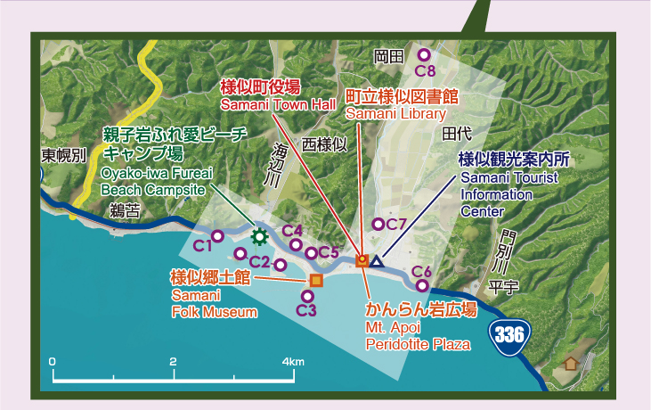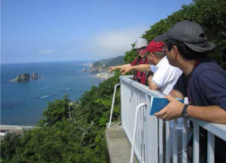 切り立ったアポイ山塊の地形とは対照的に、その西方にはなだらかな丘陵地が広がり、海岸線沿いには様似の市街地が形成されています。海岸線には、大小いくつもの岩山が並び、アポイ山塊とともにこの地域の景観的特徴を表していますが、この独特の景観には、何百年も自然と共生してきたアイヌの人々の伝説が数多く残されています。その一つ、昔チャシ(砦)があったとされる観音山は、様似漁港を見下ろす標高100mほどの小さな山。展望台からは海に浮かぶ岩山やアポイ岳などが一望できます。