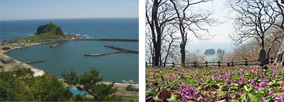 観音山の展望台からの眺めは、エンルム岬に負けず劣らず爽快です。真下に見えるのが様似漁港ですが、漁港の内外に点在する奇岩(看板参照)は、「ひん岩」というマグマが冷えて固まった火成岩の一種で、横一線に並んでいるのは、プレート運動によって地殻がこの方向に強く圧縮され、その力と同じ方向に割れ目ができ、そこに下からマグマが入り込んだことを示しています。