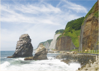 えりも町の黄金道路と同様に日高山脈の南端にあたり、古くは交通の難所でもありました。断崖上には、約200年前に開削された「様似(シャマニ)山道」があり、現在はフットパスコースとして親しまれています。また、断崖下はかんらん岩の恵みを受けた良質の日高昆布(ミツイシコンブ)が生育しており、磯船での昆布採りや昆布の天日干し作業は、この辺りの夏の風物詩です。
