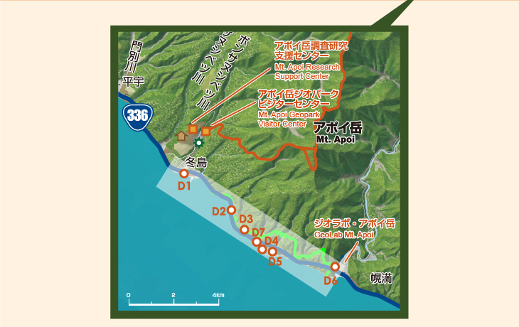 アポイ岳の山裾が太平洋に落ち込み、約7kmの断崖絶壁をつくっているのが、日高耶馬渓と呼ばれる海食崖です。この場所は、かつてのユーラシアプレートと北米プレートがぶつかった場所といわれており、エリア内には一部ながらその境界部(日高主衝上断層)も残されています。