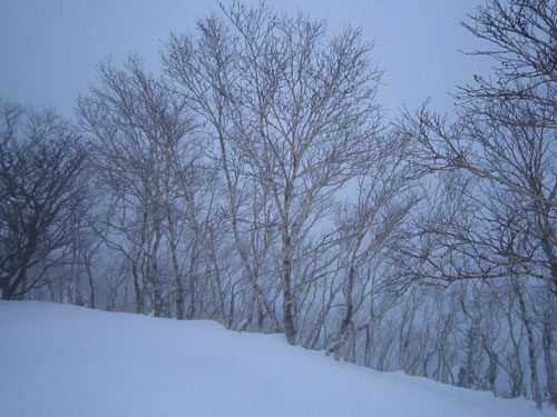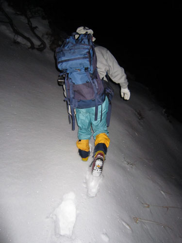 馬の背を過ぎると、前の人の足跡も見えなくなり、さらには吹き溜まりの場所では50cm以上も積ってとても歩きにくくなります。こんなとき先頭でラッセルしてくれたのが、様似山岳会きっての鉄人hideさんです。おかげで後ろを行く私たちは楽ちん。