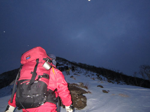 まだ真っ暗な午前3時30分過ぎ、登山口であるアポイ岳ビジターセンターを出発。登山道上には20~30cmほどの積雪がありますが、前日?の登山者がラッセルしてくれたおかげで比較的楽に登れます。空を見上げると満天の星空。御来光への期待が高まります。