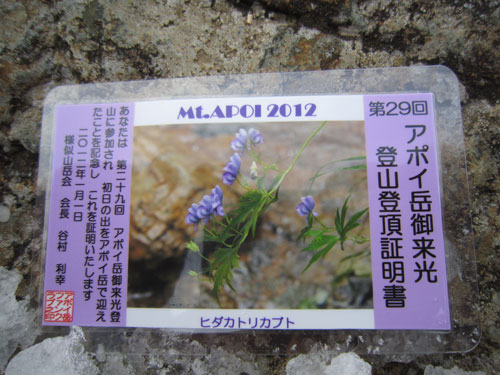 登山者全員には様似山岳会から「アポイ岳御来光登山当町証明書」が配られます。山岳会の公式行事となってから29回目ですが、御来光登山自体はそのずっと前から行われていたとのこと。証明書の花の写真は毎年種類が違うそうです。つい毎年参加して集めたくなりそうな素敵なデザインですよね。