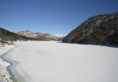 幌満ダム湖はこのとおり完全氷結。この日は風もなく音のない白い世界が広がっていました。あちらこちらに足跡あれど、シカの1頭も姿を現さず、ちょっと寂しい…。