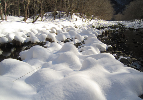 幌満峡をさかのぼっていくこと約5㎞。やや開けた地形となる古川付近の川では、水位が下がって顔を出した転石の上に、雪が帽子でもかぶせたように積もっていました。