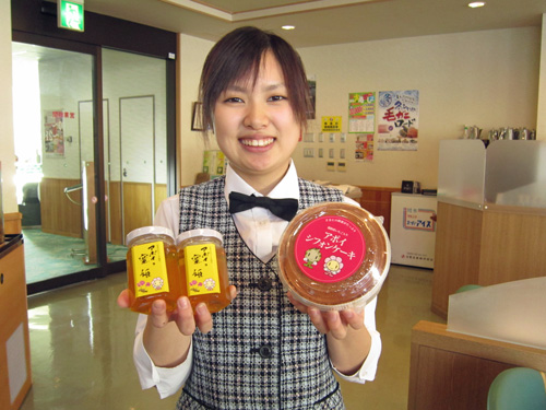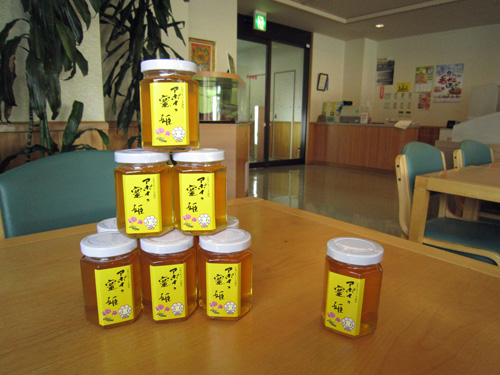 様似のハチたちが一生懸命集めたハチミツをどうぞご賞味ください。180gで830円で販売中。少し前に販売開始した、様似産いちごが入ったアポイシフォンケーキ(450円)にもたっぷり使われていますヨ。(タク)