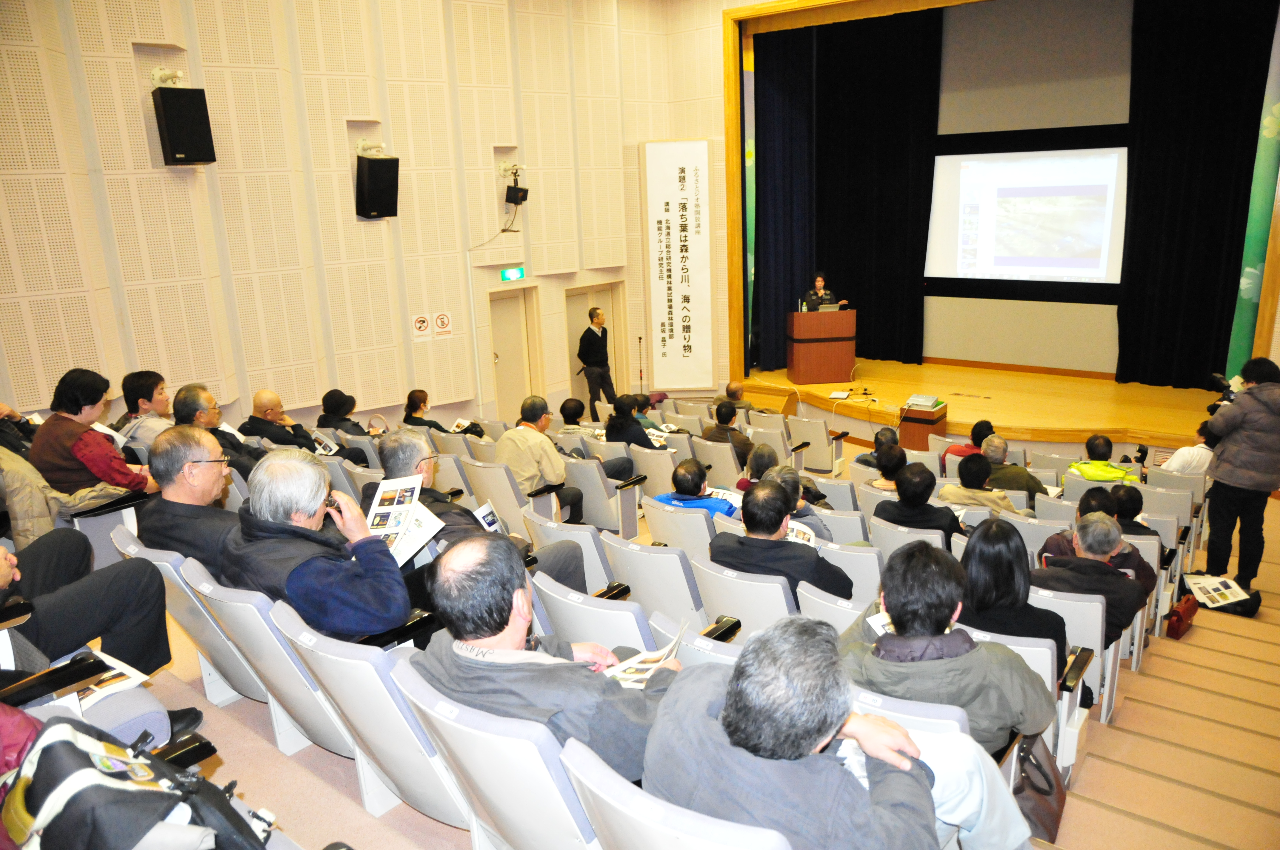 次にNaga-Sakaさんが「落ち葉は森から川、海への贈り物」と題し、自身が調査研究(美唄市濃昼川)した結果をもとに、河畔林(川沿いに生えている森)の落ち葉や虫などの有機物が川によって海へ運ばれて、どのような役割を果たしているのか講演。その中で、川を通じて流れてきた落ち葉は河口域でたまり、トンガリヨコエビという虫のエサとなり、そのトンガリヨコエビはクロガシラガレイの稚魚のエサとなる(食物連鎖)など、森と海のつながりについて話されました。