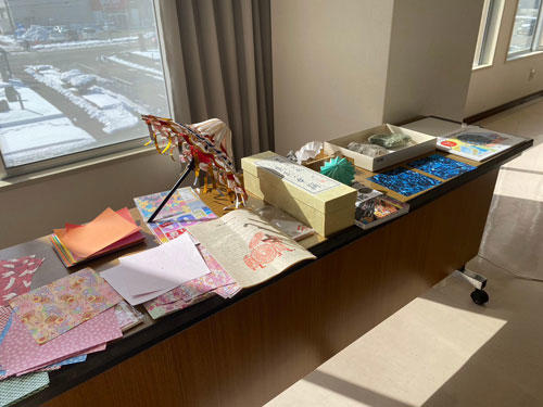 カン×カン講座は、町立様似図書館と様似郷土館とアポイ岳ジオパークビジターセンターなどの様似町にある館(カン)が連携して月1回を基本に様々な事業を開催しています。今回は各館が番傘にまつわる説明をし、様似町で身近な岩石のかんらん岩とひん岩の薄片を偏光板で観察し、そのかんらん岩の模様の折り紙も使って番傘のかざりを作りました。番傘作成の難易度は高めでしたが、楽しみながら作りました。