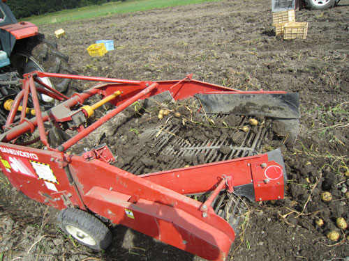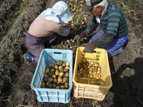 (掘り起こしたおイモを出荷品とハネ品に分けていく。もちろん手作業)