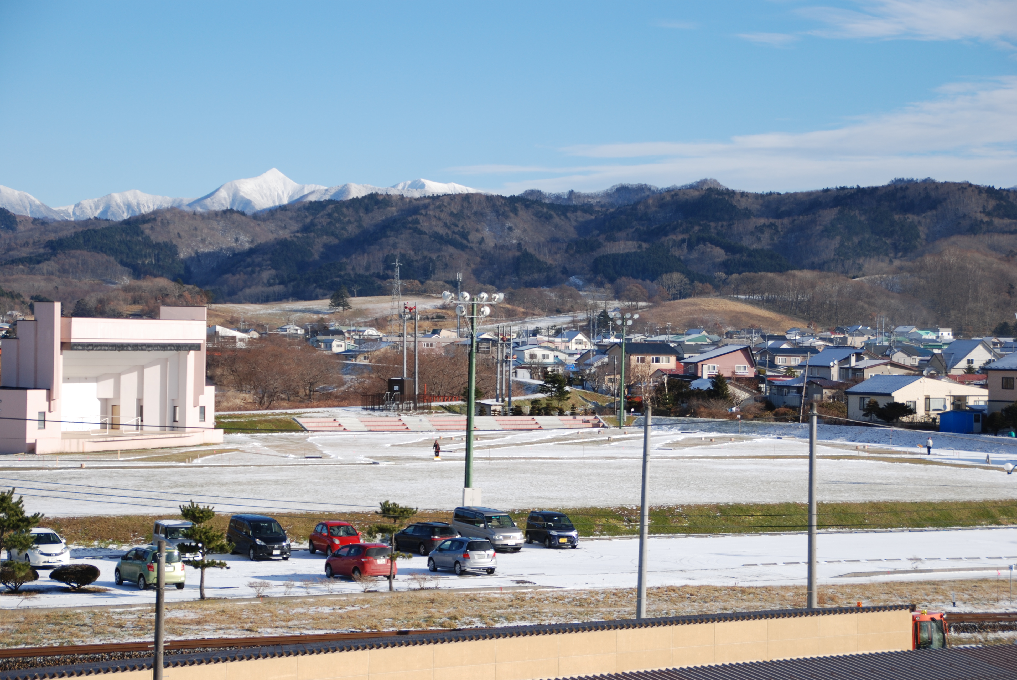 寒い中、ふれあい広場ではパークゴルフをするために除雪作業。背後には日高山脈が真っ白い顔を