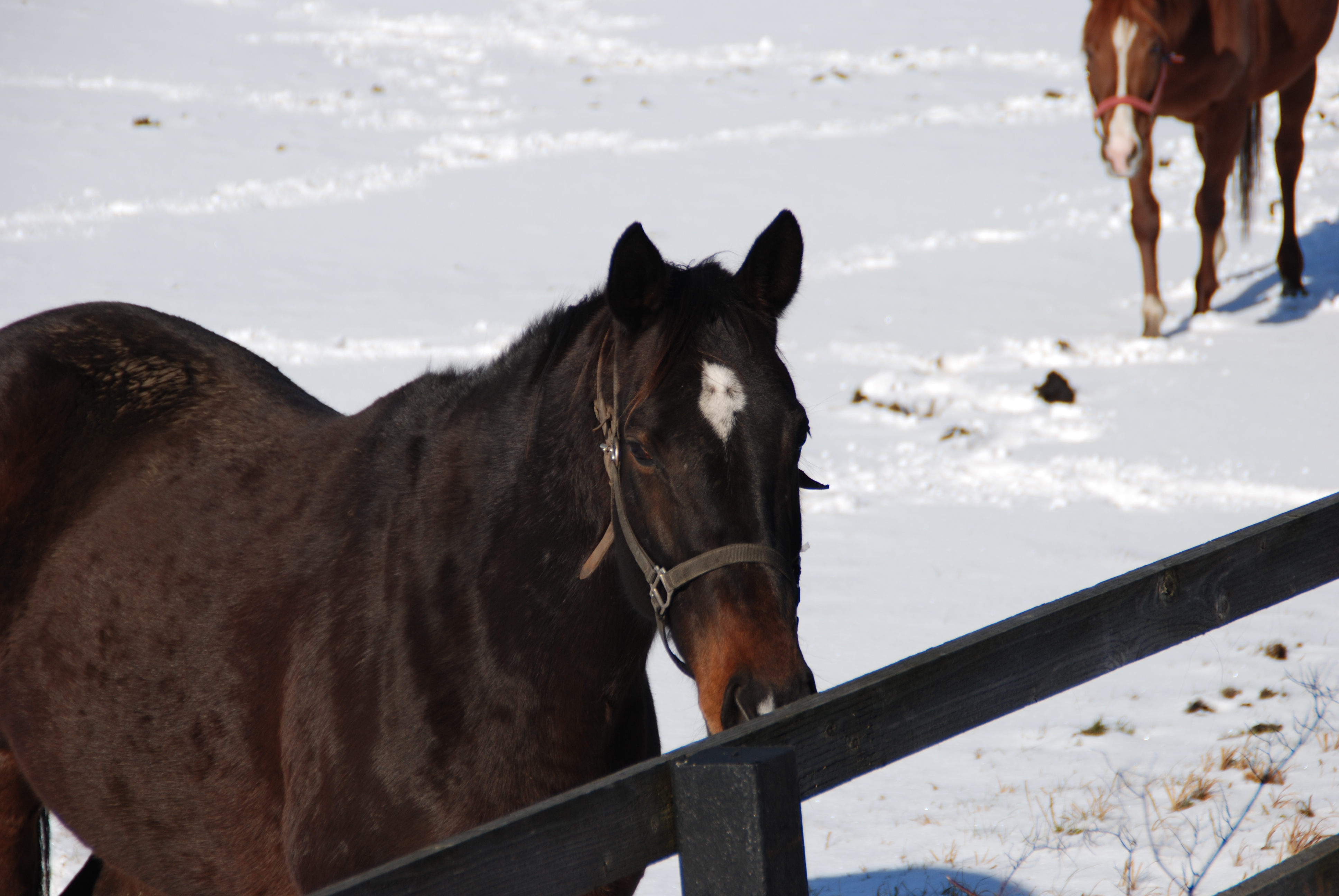 馬さんも寒い冬の間、特に繁殖牝馬は元気なとねっ子を産むため、服を着て体調管理。