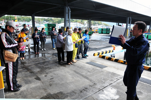公民館に集合し、ワゴン車を連ねて、様似漁港へ移動。港内に着