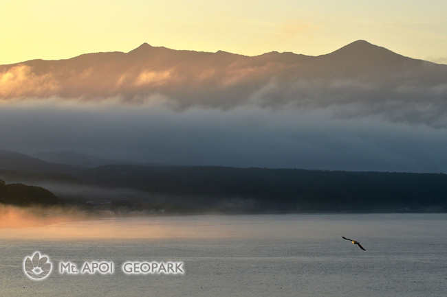 朝靄が立ちこめた様似町の朝。朝日を浴びながら目覚めてい秀峰アポイを表現しました。