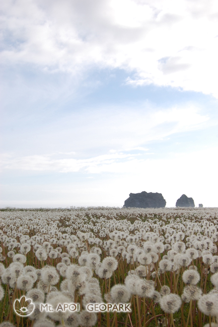 ふわふわ広がる陸の雲と空の雲。雲の野原に浮かぶ親子岩の存在感を切りとりました。