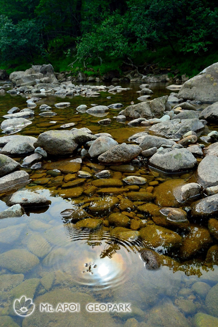 幌満川のかんらん岩に目を凝らしていると太陽の光に照らされて、ミズスマシが泳いでいました。取り合わせが面白く、シャッターを切りました。
