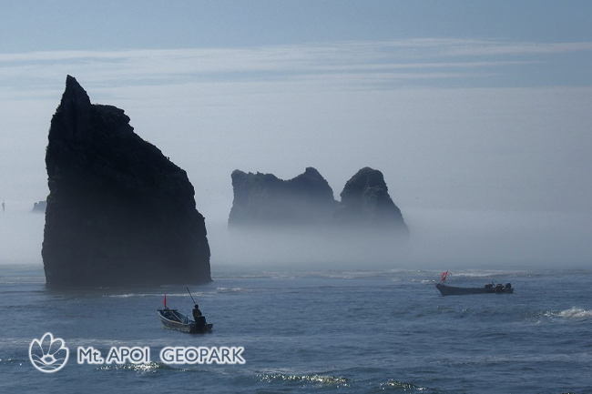 コンブ漁の解禁の朝、ガスで見えなかった親子岩、コンブ舟が時間と共に見えて来て今年も始まったという気持です。