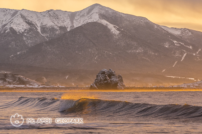 海霧がたつアポイ岳を臨む光景に朝日が昇り色づいた。アポイ岳、親子岩、海を狙って撮影しました。