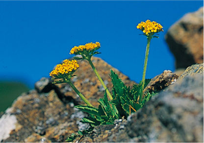 - This perennial grows to approximately 15 cm in height. The radical leaves, spoon-shaped and numerous, are deeply pinnate. The flowers bloom in flat clusters at the tips of the branches.