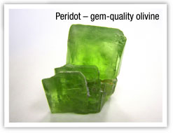 Peridotite is composed chiefly of the minerals olivine, orthopyroxene and clinopyroxene, with the olive-green olivine dominating. This beautiful crystal is sometimes used as a gemstone called peridot, which is the birthstone for August. The term olivine is derived from its olive-green color. As the rock was originally located deep under the earth's surface, it is close-grained and hard with a specific gravity as high as 3.0 - 3.3 (g/cm3).