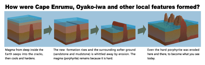 Rocky monoliths are found along the coast to the west of Mt. Apo, forming a clear contrast with the gently sloping terrain. They are made up of porphyrite - a type of igneous rock that formed when magma penetrated cracks in the crust before cooling and solidifying there. The area's oddly shaped rocks are made of hard porphyrite that remained while the surrounding soft sedimentary rocks were stripped away by years of erosion. Magma intruded into cracks around 17.7 million years ago (during the Neogene Period of the Cenozoic Era) before the formation of Mt. Apoi, presumably due to crustal compression caused by the subduction of the Pacific Plate.