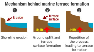 - *Marine terraces are a series of flat, stair-like tiers created by coastal erosion, ground uplift, and sea-level lowering caused by crustal movement. Among the four terraces, it's believed that the land at an elevation of 25 to 40 meters high includes a layer of volcanic ash from the formation of Toya Caldera that occurred around 110,000 years ago and would have been where the shoreline existed during the previous interglacial period around 120,000 years ago.