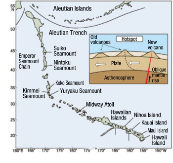 This limestone came from far to the south. Hawaii is known in particular for eruptions of Kilauea Volcano; beneath its islands is a hotspot where magma wells up from the mantle through the plate and reaches the surface. The formation of the Hawaiian Islands results from local volcanic activity that has continued for more than 70 million years.
