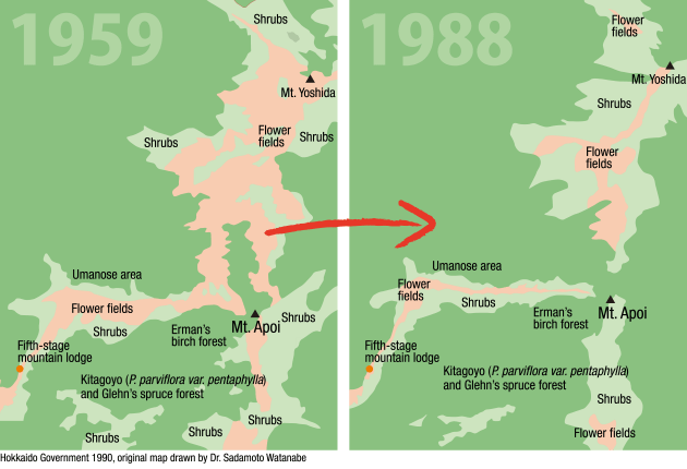 The Hidakaso (Callianthemum miyabeanum) species symbolizing Mt Apoi's alpine plants faces the risk of extinction, and the area's plant communities are rapidly declining. This is the stark reality of Mt. Apoi's vegetation. Due to illegal digging for personal gardens and flower shops that peaked in the 1990s, fewer and fewer Hidakaso flowers have been seen. They were even at risk of total disappearance from the Horoman flower fields , which were damaged by digging on a devastating scale. Although illegal digging has now been almost entirely stopped, the decline of alpine plant communities continues because, in addition to a reduced number of individual plants, dwarf stone pines and Kitagoyo (P. parviflora var. pentaphylla) have encroached on flower fields, depriving other species of their habitats. This situation may be attributable to factors including global warming, acid rain, and Hokkaido sika deer feeding on plants, but the actual causes have not yet been confirmed.