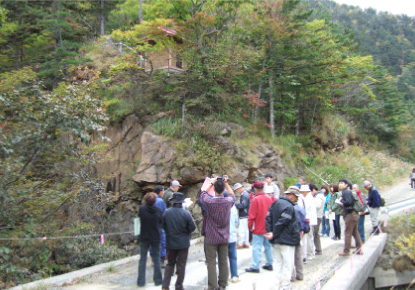 A compact shrine to the guardian deity Acala stands to the upper left of a small bridge along the forest road. Behind the shrine is a small waterfall known as Fudo-no-sawa, and nearby are outcrops of a typical Horoman peroditite rock called plagioclase lherzolite, which is a peridotite type that lost little of its magma content after partially melting. Another peridotite type known as harzburgite, which is a residual kind highly depleted of its magma content, is found in the area from the bridge to the upstream riverbank.