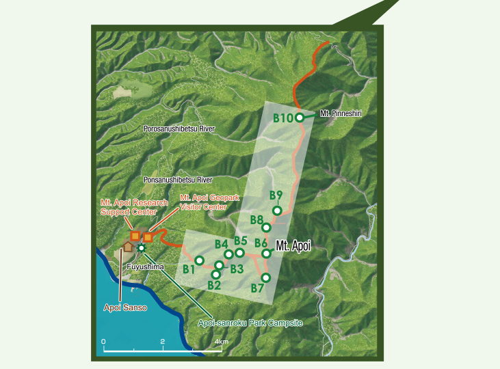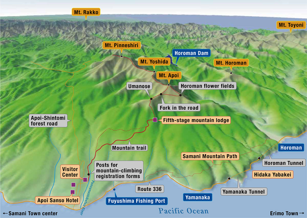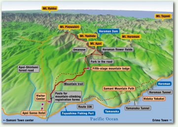 It takes between 2.5 and 3.5 hours to reach the summit, and 4.5 to 6 hours for the round trip. Mt. Apoi - a rich habitat for flowers - is made up of peridotites from deep in the earth's mantle. Climbers flock there year after year to enjoy its precious natural environment.