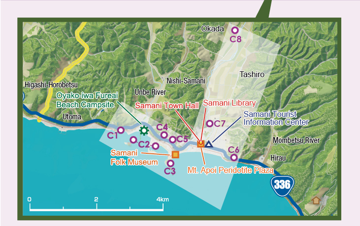 In contrast to the geology of the towering Apoi Mountains, the area to their west is characterized by gently sloping terrain, with Samani Town center located on the coastline. Along with the Apoi Mountains, rocky peaks of varying sizes flanking the sea characterize the region's landscape. The unique scenery here is associated with numerous legends of the Ainu people, who have lived in harmony with the natural environment for hundreds of years. One of these rocky mountains is Mt. Kannon, thought to have previously been the site of a chashi (fort). With a height of only 100 meters or so, this peak overlooks Samani Fishing Port and has an observatory that affords sweeping views of rock formations in the sea as well as Mt. Apoi and other local icons.