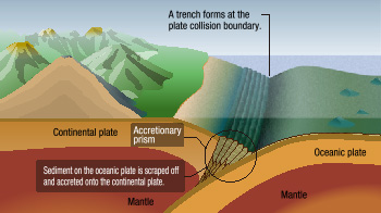 The Japanese archipelago is an aggregation of accretionary prisms. These are formed from the surface layer of an oceanic plate that is scraped off and accreted onto a continental plate when the two collide and the former subducts beneath the latter in a trench on the ocean floor. Sandstone and mudstone or sediment from the overriding plate as well as limestone, chert and basalt from southern seas thousands of kilometers away are mixed and undergo deformation, forming a rough aggregate of different rocks known as a mélange.