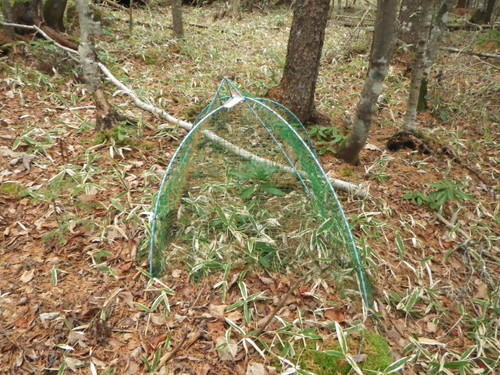 This net was used for I or S's graduation research/doctorate research and teacher S's vegetation survey. The survey was designed to compare the vegetation in the covered and non-covered spaces and reveal the impact that the Ezo deer have on the surrounding area. Only miyakozasa, a variety of bamboo grass, remained inside the nets along the base of the mountain. I was reminded of the surprising effects of the deer and memories about setting up the nets from 10 years ago came rushing back to me.