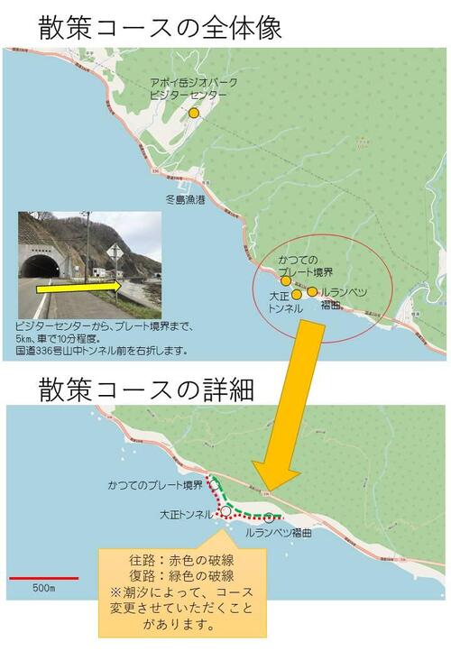 大正トンネル、ルランベツ付近の海岸の礫浜と歩道を歩きます。