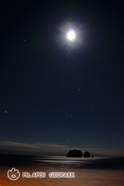 真夜中に月のあかりによって、親子岩が暗闇から浮かびあがった。