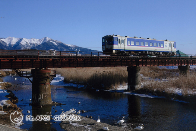 アポイ岳を背景にJR日高線と冬の使者オオハクチョウ。