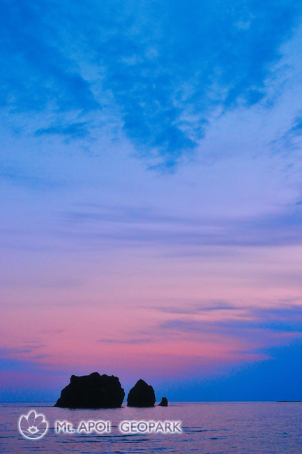様似のシンボルの一つ、親子岩の夕景。特に上空の雲の形が面白いと思いました。