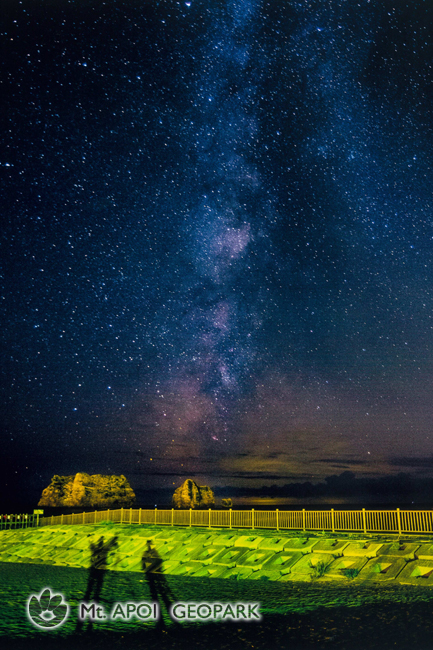 親子岩の後ろに流れる天の川と街頭で映った自分たちの影を入れて撮りました。