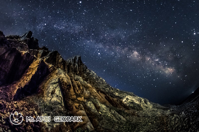 そびえ立つ岩肌を見せるエンルム岬とエンルム岬で街の明かりが遮られ現れた天の川を狙って撮影しました。