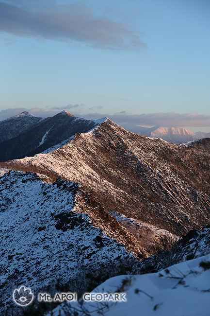 美しい御来光を拝ませていただきアポイ山頂を下りだすと日高山脈の稜線が輝いて感動した。
