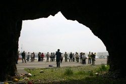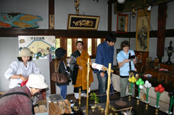 | 蝦夷三官寺・等じゅ院護摩堂で、副住職の大久保唯行さんから説明を受ける | 日高耶馬渓の玄関口・冬島の穴岩で変成岩の成り立ちを学ぶ |