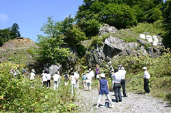 | 新富の旧石灰石鉱山で、地層がかく乱する様子(メランジュ)を観察し、鍾乳洞の存在について想像を膨らませる。 |