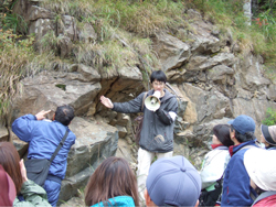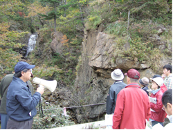 | 暖かいせいか例年なら見頃となる紅葉もまだまだでした(ジオサイトA6:稲荷神社) | 島田先生の解説(ジサオイトA4:不動の沢) |