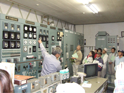 | 幌満で研究中の北大・梅沢くんもかんらん岩に含まれる斜長石について解説(A4) | 幌満川第3発電所の内部を草地所長に案内してもらいました。 |