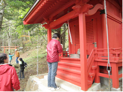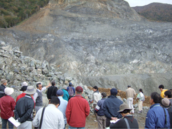 | 東邦オリビンのかんらん岩採石場で横見所長の説明を受ける。 | パワースポットの呼び声高い稲荷神社で商売繁盛祈願? |